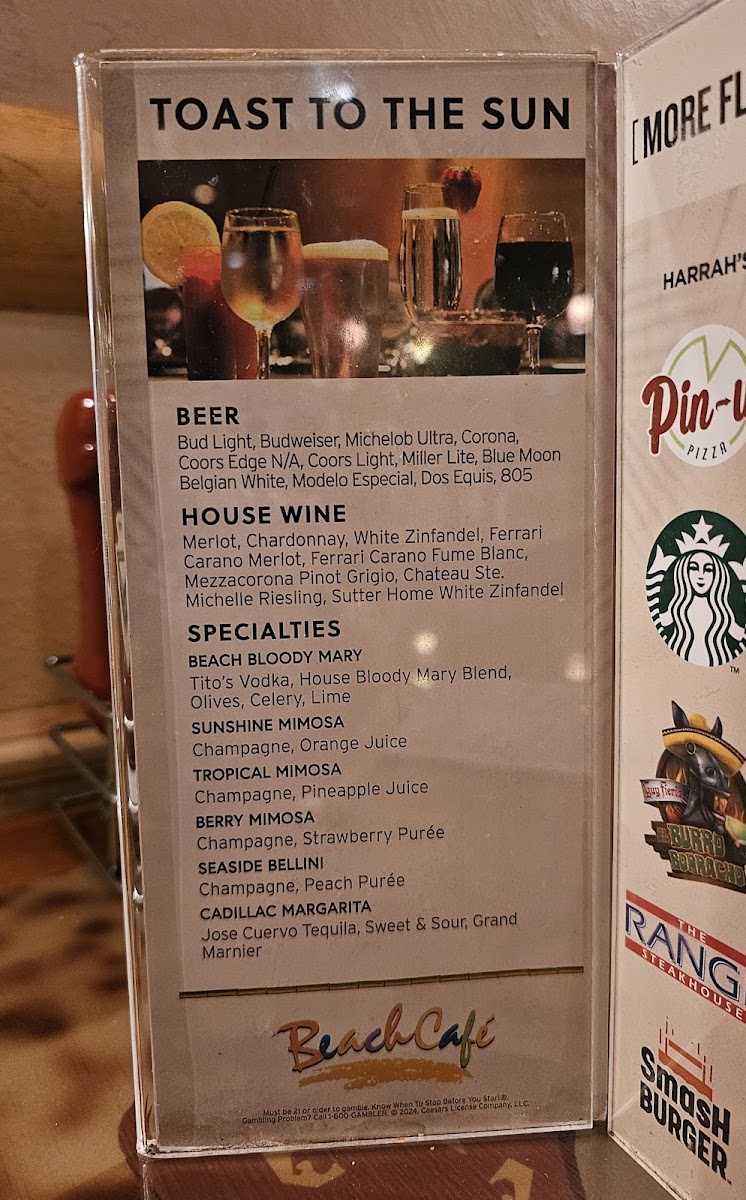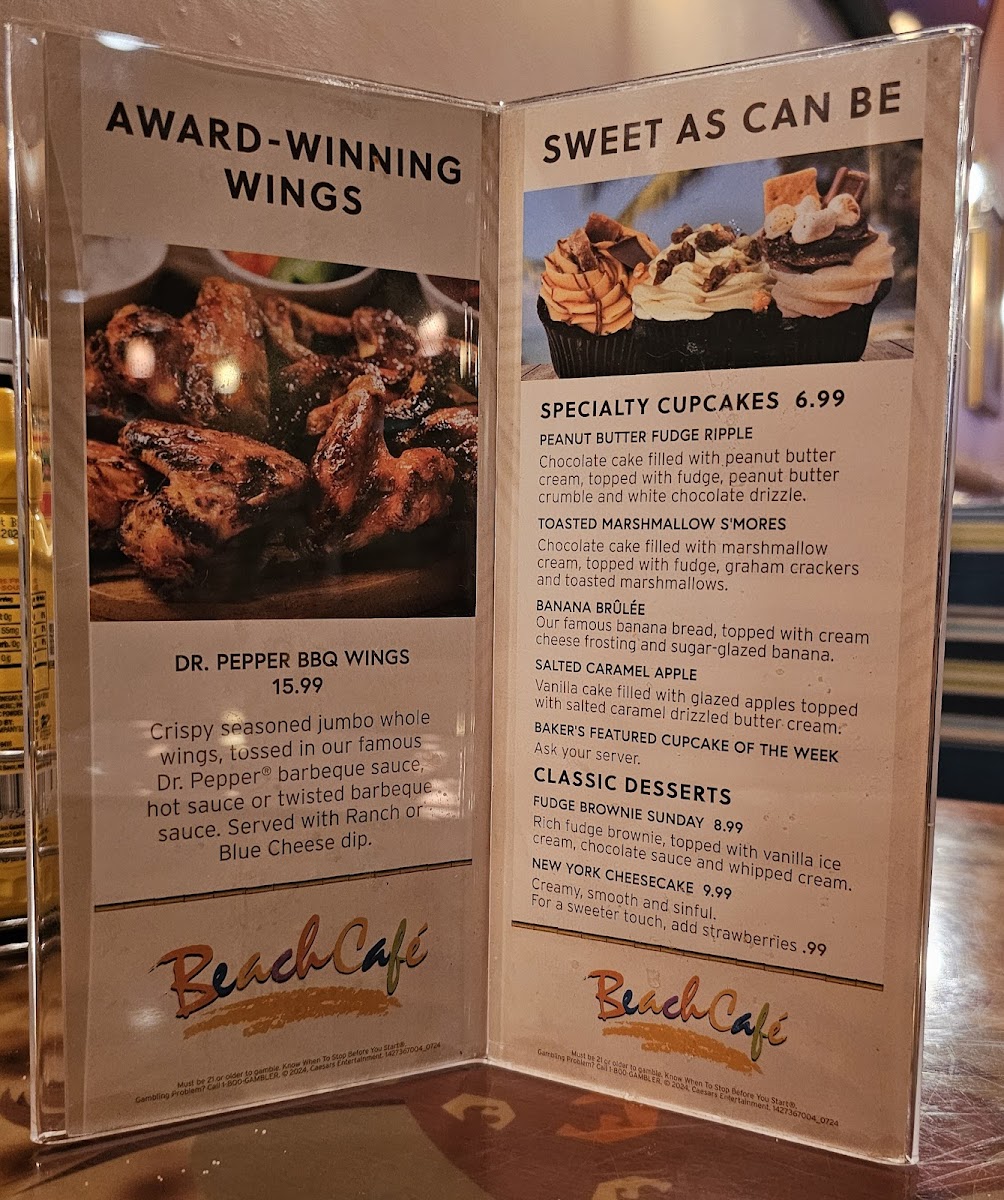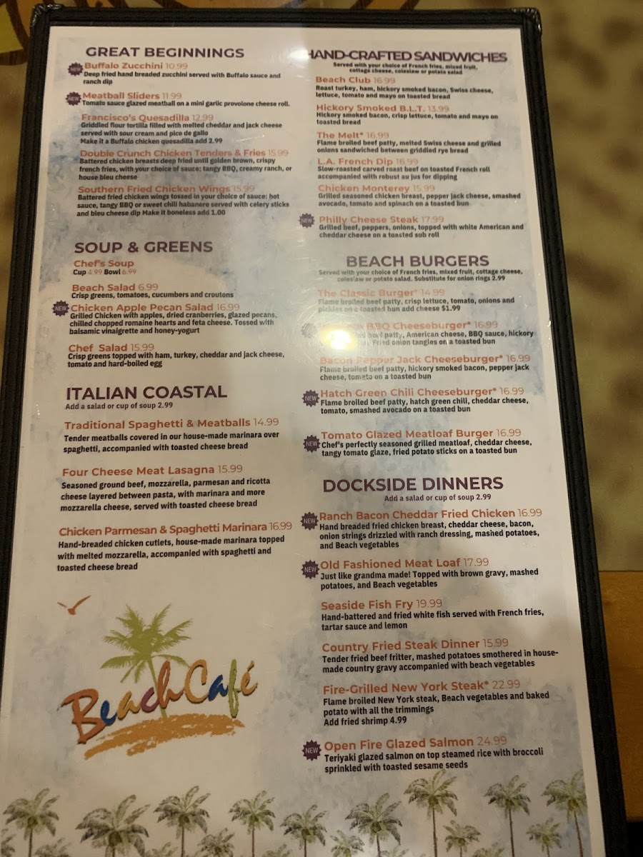 The menu at Beach Cafe Harrah's Laughlin Casino features a variety of American restaurant selections organized into several key categories. Diners can find options suitable for breakfast, lunch, and dinner, making the menu versatile for different meal occasions.
